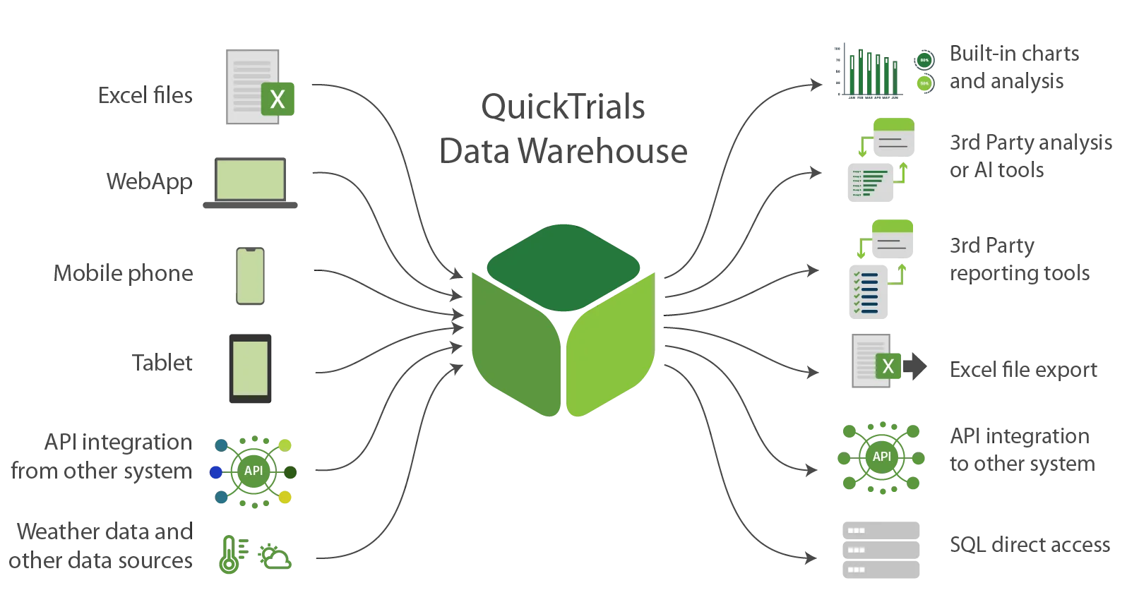 QuickTrials creates a powerful, centralised, data warehouse that becomes your single source of truth for all trial data across the company. It receives data from multiple sources and enables many types of analysis and integration.